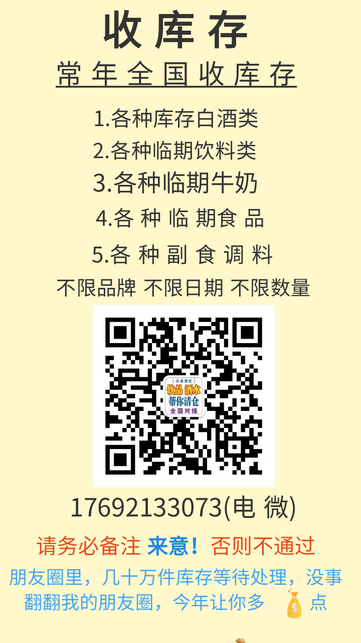 有临期库存?找临期货源?今天为大家推荐一个专业全国收售积压库存的平台,他们有着十几年的从业经验,这里都是临期货源的顶级源头,长期收售,不限品牌,产品每天随时更新,帮你解决库存烦恼的同时又给我们带来更多的优惠产品,让我们在不大量压货的同时可以赚更多. 加微注意:这里都是批量发货,不零售 不散拼 行业小白请勿扰! 这里都是批量发货,不零售 不散拼 行业小白请勿扰! 加微备注:请一定要填写备注来意!不备注不通过!